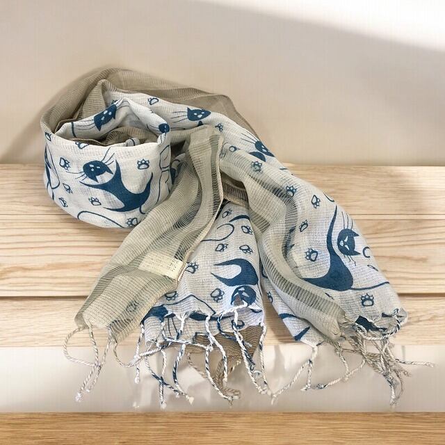 躍動感のあるねこ柄と両サイドにシースルーのストライプのコンビのデザインがかわいい、軽いシルク混の素材使用のライトストールです♪