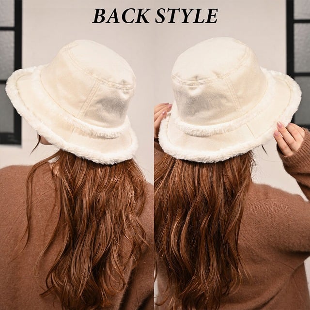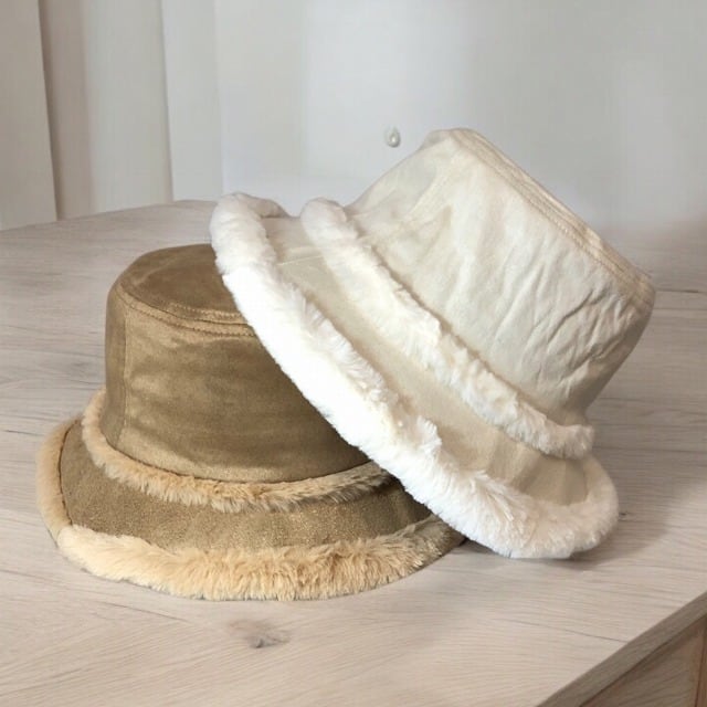 ムートン風のボリュームのあるデザインがかわいい♪切り替えファーがアクセントの、ポリスウェードのふわふわバケットハットです。