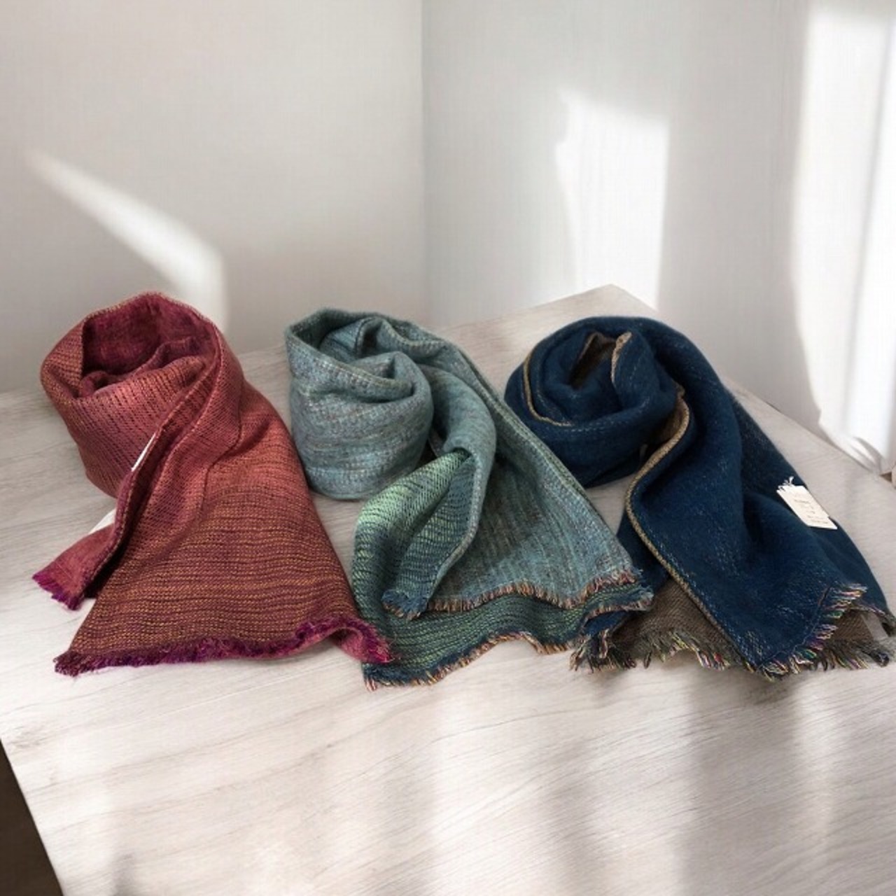 カラフルできれいなデザインが目を惹く、表裏でデザインの異なるリバーシブル仕様のマフラーです!