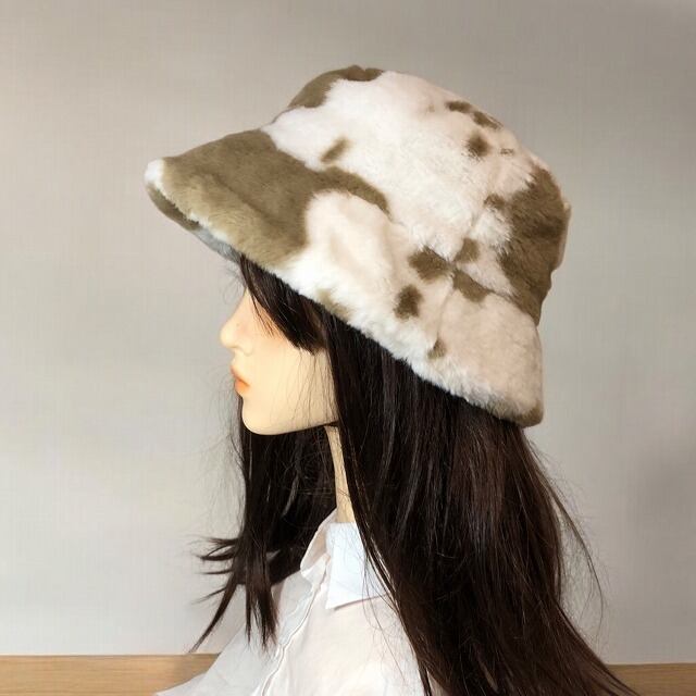 目を惹くベージュ系の牛柄がかわいい♪ふわふわファーのバケットハット☆