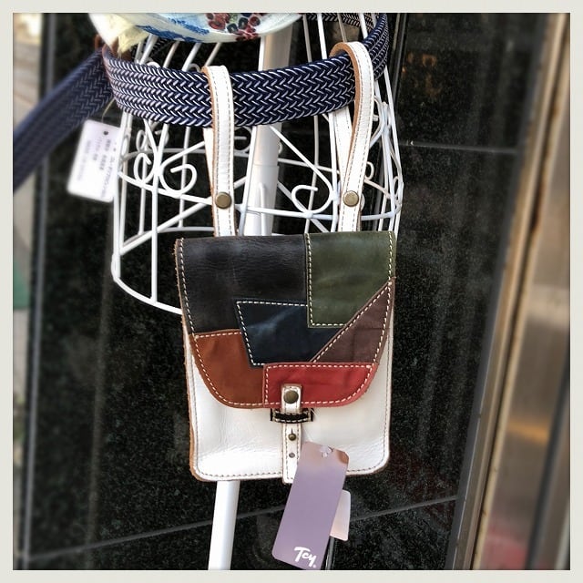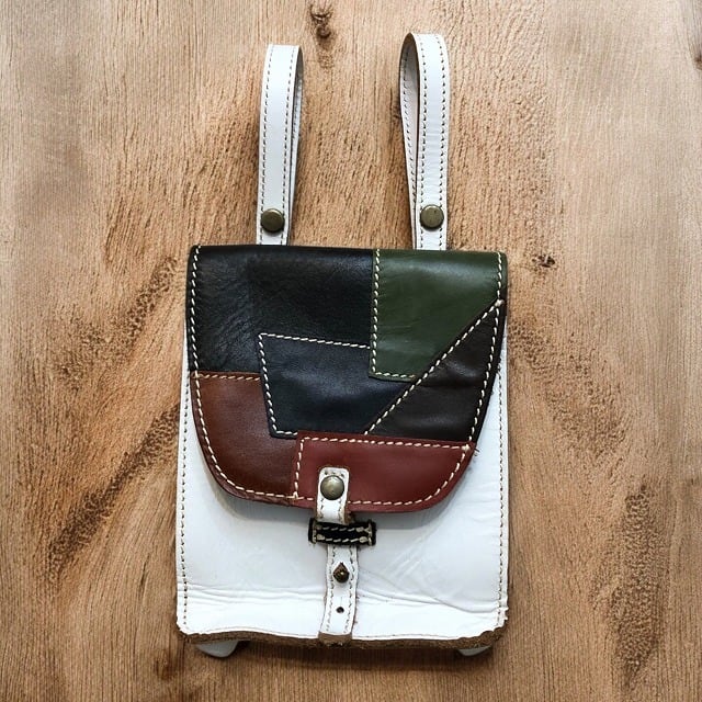 蓋部分のパッチワークのデザインがおしゃれな、コンパクトで便利な本革チョークバッグ♪