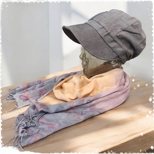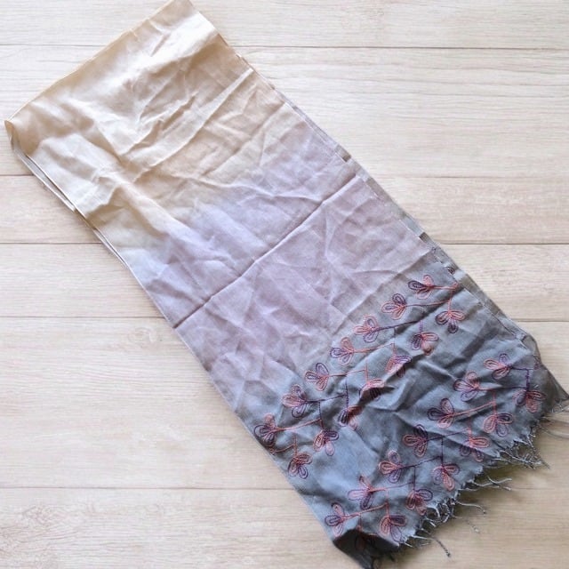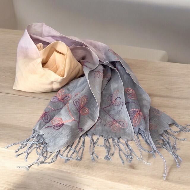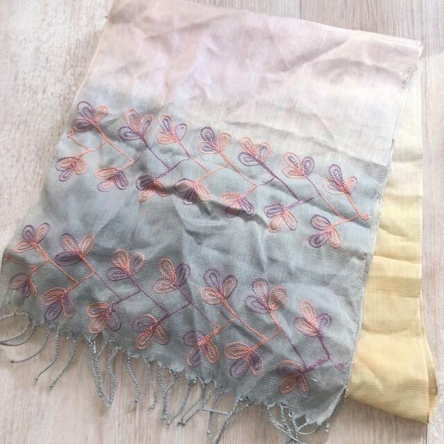 春夏の新作♪鮮やかなグラデーションがきれいな、植物柄のチェーンステッチ入りののフリンジ付きストールです♪
