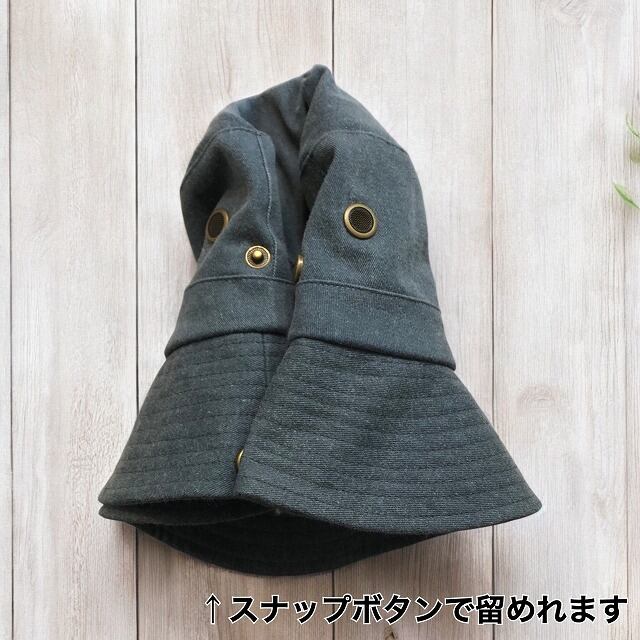 両サイドについたスナップボタンでつばを上げて留めたり、折り畳んで留めたりできる便利アイテム。